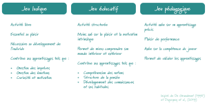 Par ailleurs, De Grandmont propose une typologie en 3 axes des jeux. Elle distingue ainsi le jeu ludique, le jeu éducatif et le jeu pédagogique. Le tableau suivant présente un aperçu de cette typologie.