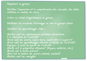 En particulier, il s’agit du moment permettant de préciser les règles du jeu. Celles-ci peuvent être explicites et dirigées vers l’atteinte d’un objectif précis ou elles peuvent être négociées et construites au fur et à mesure du jeu (Brougère, 2008). En ce sens, il importe de décrire comment la réalisation de l’activité sera utile pour développer les compétences visées. Il s’agit aussi d’une occasion pour attribuer les rôles aux personnes participantes et de préciser les consignes liées aux contraintes de temps et d’espace.