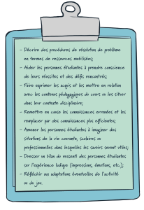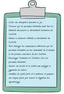 De plus, plusieurs travaux mettent en lumière l’importance de l’attitude ludique et d’un climat d’apprentissage positif lors de l’animation d’activités en classe (Lauricella et Edmunds, 2022). Ces deux éléments jouent un rôle clé dans la création d’une expérience d’enseignement-apprentissage significative et positive (Hovington et Lépine, 2023).